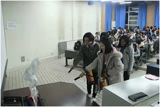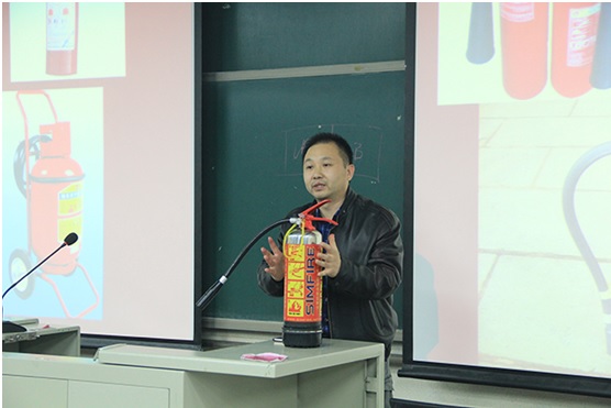 讲座开始,李俊升老师向大家讲解基本的防火安全常识和火灾自救基本方法,教授同学们灭火器的正确使用流程和方法并让全体同学依次上台练习使用。呼吁大家注意用火安全,强化大家的安全防火意识。