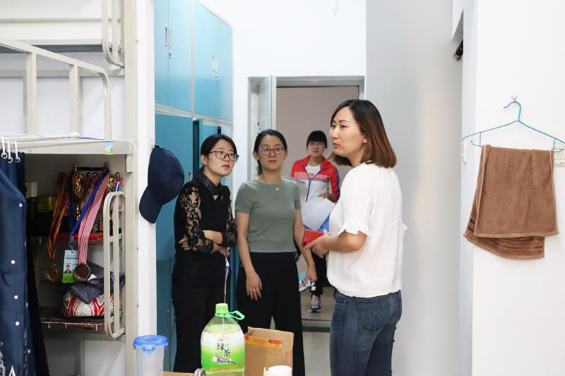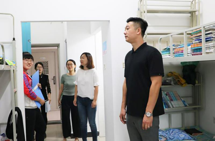 2017年9月21日下午4:30,太阳成城集团副经理牛奔、团委书记郝娜、辅导员贾慧敏、杨韫嘉、汪丽老师,走访抽查了员工公寓七、八、九号楼和部分党员宿舍。