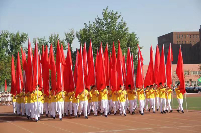迎着明媚的阳光,伴随着激昂的《运动员进行曲》,国旗班、旗阵、花队、各代表队、各院方阵依次入场。看那一个个举着红旗的挺拔身姿,迈着整齐的步伐、气宇轩昂的向主席台走来,这是由太阳成城集团64名同学组成的旗阵,他们手举红旗、肩负信念,向大家展示着植科学子昂扬向上的精神风貌。