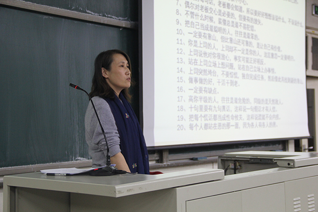 3月8日,贾慧敏为全体2016级员工讲解了3月以来最热点的实时问题——有关萨德的相关时事。贾慧敏通过一系列对于萨德有关问题的提问带起了员工们的积极性,通过对于热点问题的剖析与讲解令在座同学对萨德有了更深层次的理解,更深的唤醒了同学们的国家使命感与爱国之情,并让同学们的思想趋于冷静。