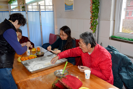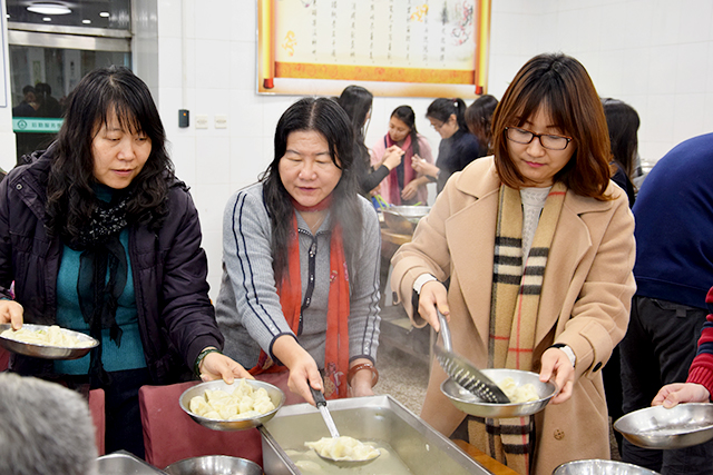 伴着刘正坪老师悠扬的古筝声,欣赏着这优美的音乐,品尝着老师们从自家带来的水果,会包饺子的老师们各展身手,开始了象征着中国团圆的包饺子活动。老师们分工合作,揉面、擀皮、包饺子,在饺子中放上花生、板栗、钢镚、枸杞(老师们自发提前备好的)等祝福,一个个小巧玲珑的饺子很快整齐地摆在面前。大家欣赏着饺子,相互祝福着。