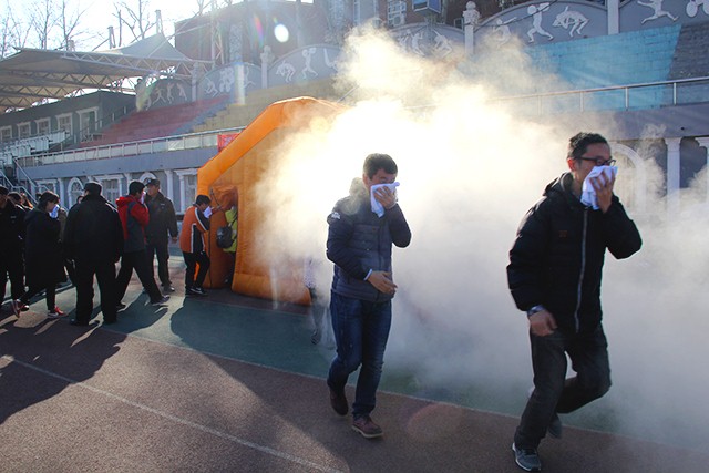 12:30,演练正式开始。冒着浓烟的模拟火场着实让同学们吓了一跳,但是有了李老师所说明的正确逃生姿势,同学们用湿毛巾捂住口鼻,排着队依次穿过了模拟火场。在员工们演练完成之后,包括院办公室主任李梅在内的老师们也进行了这次模拟的逃生演练。
