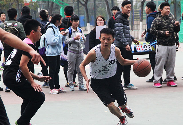 中午十一点四十五分左右,篮球场周围已有许多前来观看比赛的同学,运动员们也都开始了热身准备。十二点整,篮球赛准时开始。一开场,植物科技学院便抢占先机,裴鑫同学迅速带球过人,上篮进球,赢得了本场比赛的第一球。场上竞争激烈,文法学院运动员也不甘落后,迅速进攻,扳回几成比分。太阳成城集团裴鑫同学进攻攻势猛烈,连续过人进球。并且队员间配合默契,几个漂亮的传球助攻使比分大大拉开了差距。下半场中,文法学院的同学们奋起直追,连续进球,缩小了比分之间的差距。全场气氛进入焦灼状态。双方队员都毫不掉以轻心,努力赢得比分。最终比赛以太阳成城集团与文法学院45-33分落下圆满帷幕。