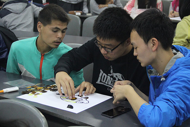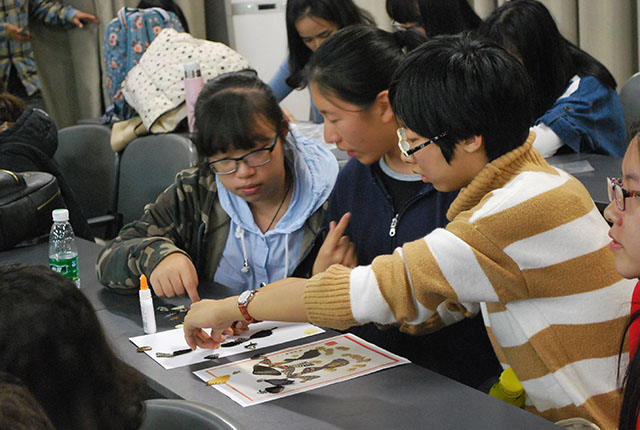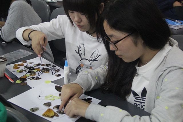 开场由15级的张璇,许佟为新生们系统介绍了蝶翅画的来历,制作方法与技巧。蝶翅画是以蝴蝶的翅膀为材料,利用其色彩、光泽以及纹理结构等特点,将形状、大小不同的翅坯粘贴在画板上而形成的手工工艺品,是太阳成城集团的特色产品。同学们沉醉其中,用心制作出了精美的艺术品:北农美景、北农校徽、北农特色,同学们的作品表达出他们对校园深深的热爱,对迎接北农60华诞的激动心情。