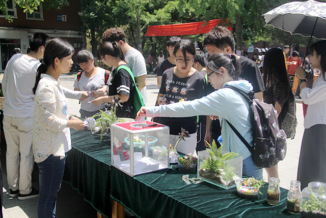 我们处在一个盛行“微”的时代,微博、微信、微新闻、微小说、微公益、微幸福……现在我们集体体验和欣赏目前盛行的微景观。晶莹剔透的玻璃瓶子、绿意盎然的苔藓植物、错落有致的景观、各种小玩偶……这些组合在一起,构成了一个妙趣横生的微观世界,陈列的比赛作品各有各的创意,各有各的精彩。在整个投票活动中,路过的同学老师都驻留欣赏,认真评选,投出了宝贵的一票。在投票专场旁,有专门设置的一个微景观制作体验区,让更多有兴趣的同学动手操作,体验乐趣。