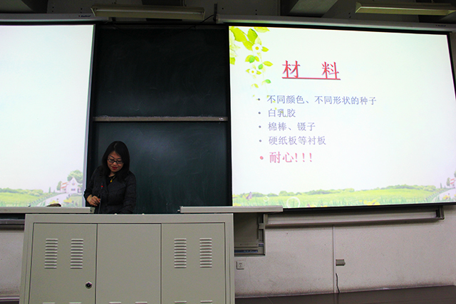 首先,李润枝讲解了最常见的粮食作物与油料作物的种子的形态分类,接着,说明了农学的大体分类,让同学们观看了常见种子资源的图片,并介绍了种子包衣的加工技术。会议的最后,李润枝向同学们介绍了种子画的制作方式:先选取需要的大小、形状、颜色不同的种子,在硬纸板上创造出种子画的大体轮廓,再用镊子夹取种子,用乳胶将种子沾在硬纸板上,最后将多余的胶擦去。为了使员工有更直观的感受,李老师用一些优秀种子画作为示范给员工进行了讲解,并重点强调制作种子画要有耐心。