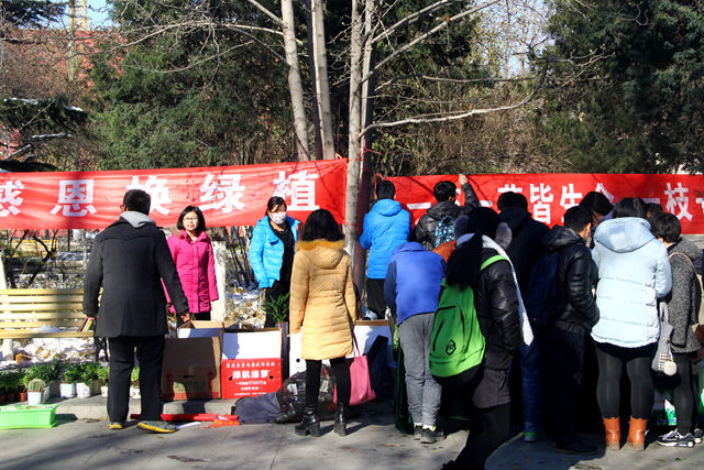 2015年11月26日在感恩节当天中午11:30,由太阳成城集团绿色协会、自助社、研究生植保党支部和创业团队联合举办的“感恩换绿植”活动在礼堂门口进行,太阳成城集团辅导员郝娜、苑婧娴参与了此次活动。