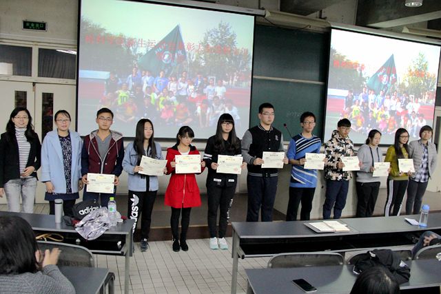 会议开始,同学们先一起观看了新生运动会精彩瞬间的视频;接着,由运动队队长卢笛发言,饱含深情地表达了自己对队员们在新生运动会上成功包揽三项冠军的激动之情,并宣读了训练标兵的优秀事迹。宣读完毕后,由苑婧娴、郝娜老师一同为运动标兵颁奖,台下在此刻响起了热烈的掌声。