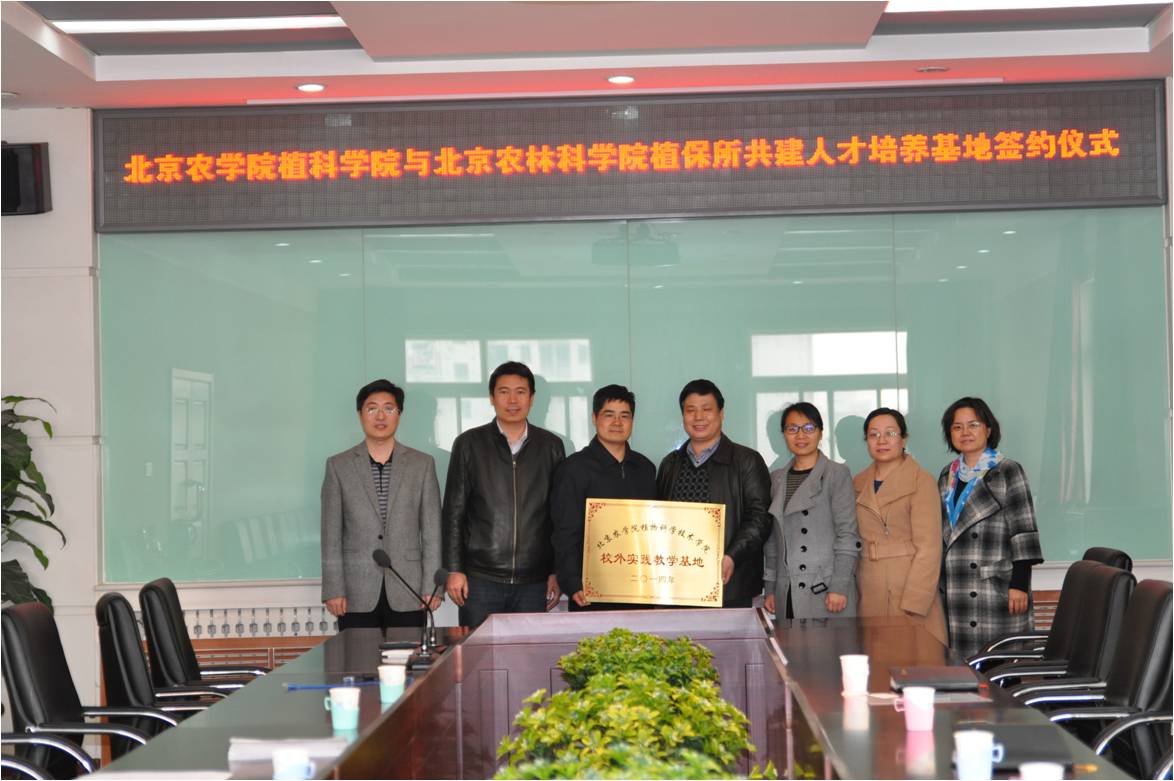 北京农林科学院植保所许奕华所长对太阳成集团官方网站董清华经理一行的到来表示了由衷的感谢和高兴。许所长介绍,全所的机构设置主要由6个研究室组成,分别为植物病害综合防治研究室、植物虫害综合防治研究室、生防微生物研究室、天敌昆虫研究室、食用菌研究室、农药与农田环境研究室;许所长还介绍了研究所近年来取得的成绩和成果,对已经结束的2014年初次的员工专业实习合作表示了肯定,对员工的表现表示了表扬和赞赏,并希望以后为太阳成集团官方网站植保系的员工实习提供更好的平台和支持。董清华副经理代表太阳成集团官方网站向北京农林科学院植保所在员工实习中给予公司的大力支持表示衷心感谢,并讲述了公司“3+1”培养模式以及校外专业实习基地成立对培养员工的意义,对植保所给员工提供的实习环境和生活环境表示认可和感谢,希望和植保所的合作迈开成功的步伐,期待着双方后续更多更广泛的合作。随后,双方就员工实习培养的细节进行了讨论,董清华副经理和许奕华所长现场签订共建协议,共同为实习基地揭牌。