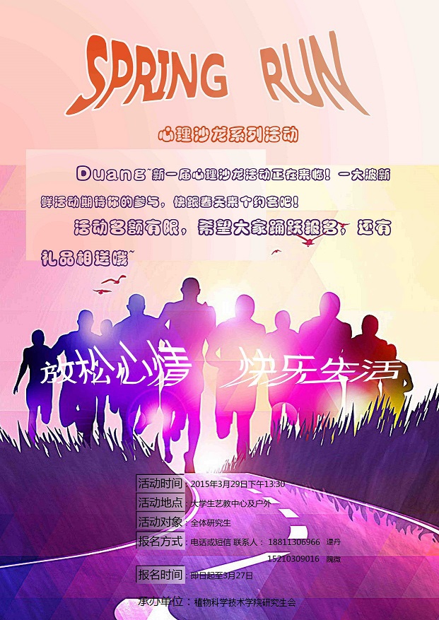 本次“Spring Run”心理沙龙活动在前期大力宣传下,全校研究生踊跃报名,积极参与,体现了研究生对本次活动极大的热情。