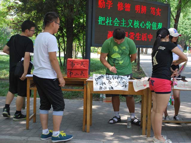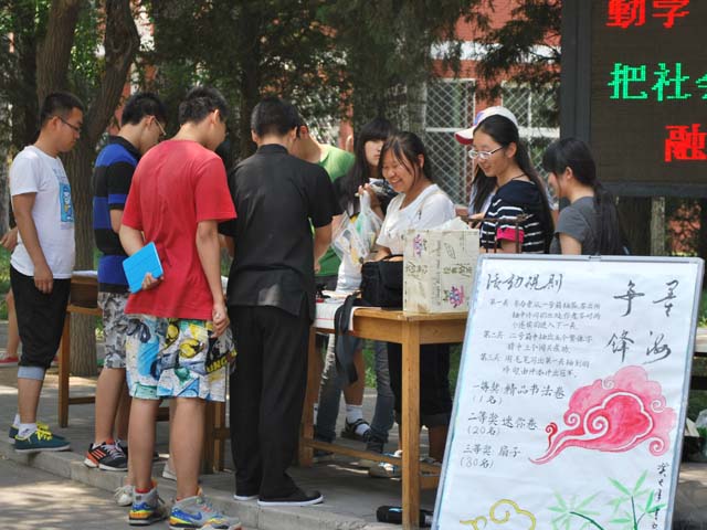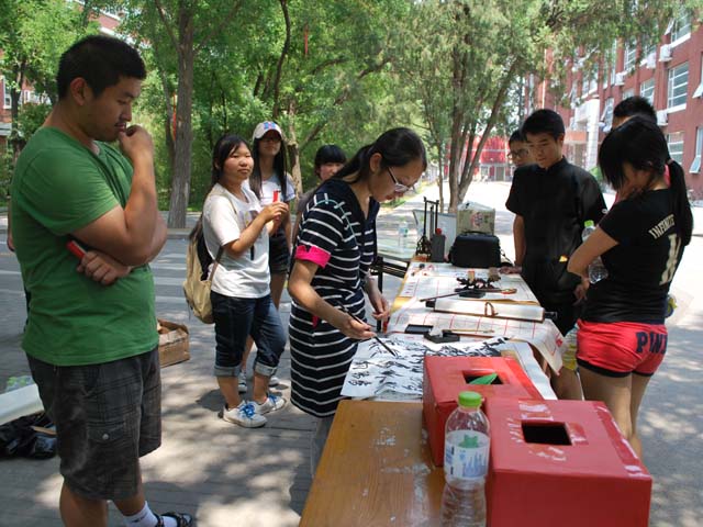 此次活动可谓是热闹非凡,成效卓越。参赛者们竞相答题,有的同学过五关斩六将还拿到了奖品,闯关失败的同学也不沮丧拿起毛笔一同感受中华文化的精髓。尽管很多同学第一次用毛笔时有点紧张,字也写的不好,但他们却爱上了书法,伏在案上写字,忘了离开,导致桌子都不够用了;还有热情的学姐拍毕业照合影留念;最终,由于员工们热情参与,忘却了时间,致使活动推迟了一个小时才结束,同学们仍意犹未尽,活动的目的及意义得到了充分展现。