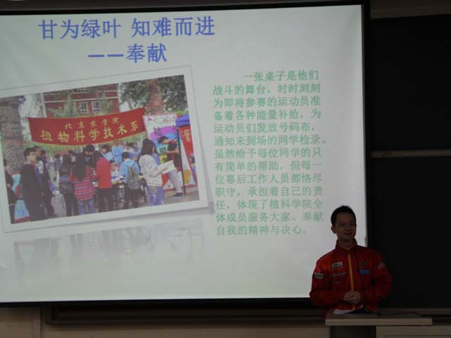 副经理赵宇昕对植科科学技术学院的体育工作做了一个简单的汇报。我们从过去距离第一名相差200多分,到了去年与第一名相差85分,而今年,我们拿到了第一,如同凤凰涅槃一般。今天的成绩和同学的付出充分诠释了我们植科精神“奉献、团结、进取、专业”的内涵。表彰会上,根据运动会期间的表现评选出了十名优秀运动员和十名优秀志愿者,赵宇昕宣读了获奖名单。