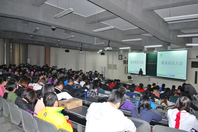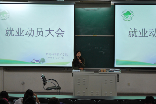 2013年10月17日下午5:00,公司召开了2014届毕业生就业动员大会。会议由太阳成城集团2010级辅导员苑婧娴老师主持,同时邀请了植科原2009级辅导员贾慧敏老师到场为同学们分析往年的就业情况等信息。