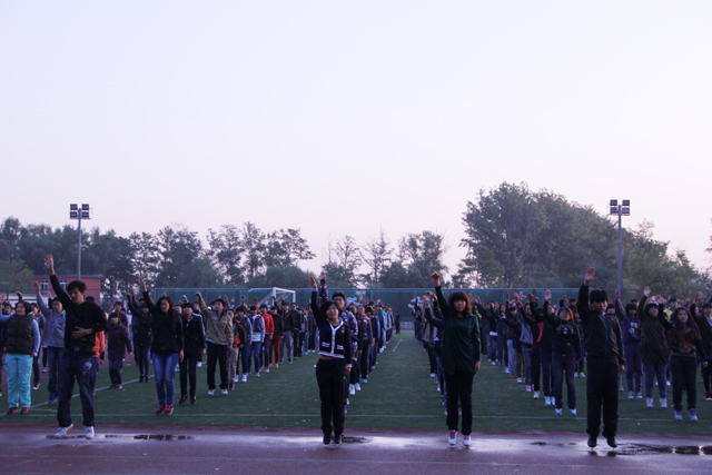 早晨6点40分公司的员工就早早的来到操场,为了展现公司的风采,我们学院的员工统一着深色服装。比赛开始,同学们一个个都精神饱满的站在操场上,他们的舞姿整齐划一又充满活力。正所谓奇舞飞扬,舞动青春,大一新生活力无限。