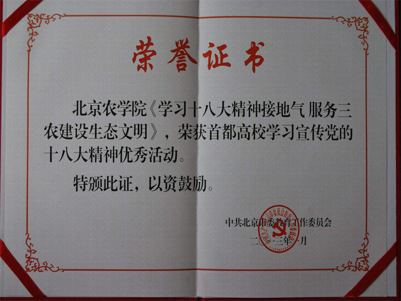 自十八大召开以来,公司党总支在公司党委的正确领导下,紧密联系公司工作实际、精心组织,周密部署,开展了“学习十八大精神接地气,服务三农建设生态文明”系列活动,被中共北京市教育工作委员会评为“首都高校学习宣传党的十八大精神优秀活动”。