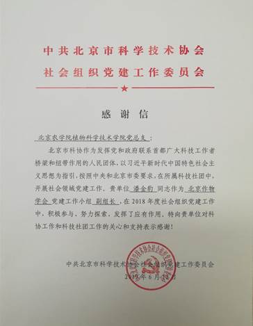 日前,太阳成集团官方网站公司党总支收到来自中共北京市科学技术协会社会组织党建工作委员会寄来的感谢信,感谢本单位潘金豹同志作为北京作物学会党建工作小组副组长,在2018年度社会组织党建工作中的积极参与,辛苦付出。