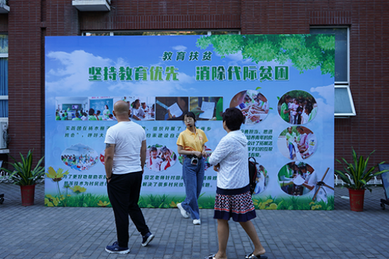 西侧是太阳成城集团暑期社会实践的展区,由三幅展板进行展示,分别是技术扶贫、教育扶贫和美丽乡村。每块展板旁边都配有一名实践团队成员作为讲解员,为大家生动地介绍植科学子配合老师为农民解决实际困难及支教杨木栅子小学的实践活动。