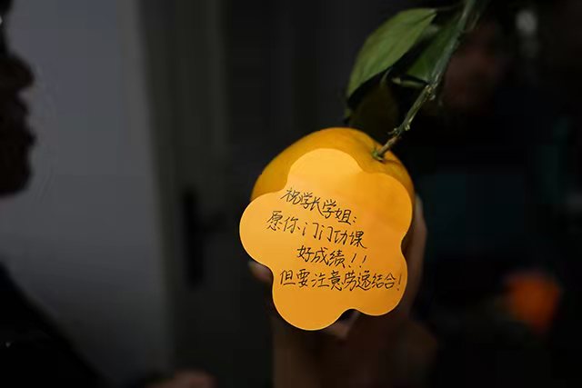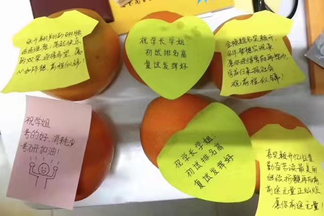 橙,寓意“成功”,承载了学院领导对2020届考研学子的殷切关心与期望。每一个香甜的橙上还加入了老师、同学们浓情的祝福,各具特色,“橙”意满满。植科学子们通过努力战至今日,从未停止学习的步伐。深夜寂静的教学楼中,满是他们身着冬衣挑灯夜战的背影;天刚蒙蒙亮,考研学子已奋笔疾书,抓紧一分一秒学习;图书馆满座,已成公司每日标配。大战在即,学院送上橙子,带给考研学子一丝甘甜,更是带去太阳成城集团深深地祝福,祝他们勇攀高峰,马到“橙”功。