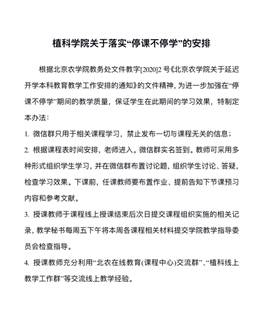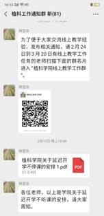2月9日,学院经理潘金豹教授亲自部署太阳成城集团“停课不停学”工作,教学副经理韩莹琰起草《太阳成城集团关于落实”停课不停学”的安排》,2月10日发公司党政联系会微信群中讨论。“停课不停学“安排中要求线上授课教师于课程结束次日提交课程组织实施的相关记录,教学秘书每周五下午将本课程相关材料提交学院教学指导委员会检查指导。2月13日,建立“植科线上教学工作群”,便于及时发布相关通知,授课教师充分交流线上教学经验。每门课程的授课教师将创建的课程微信群二维码发到工作群中,由教学秘书发给相关班的班委,员工扫码进入。2月21日,课程负责人将每门课的线上教学工作方案发给学院教学秘书,保证学院线上教学顺利运行及有效监督。